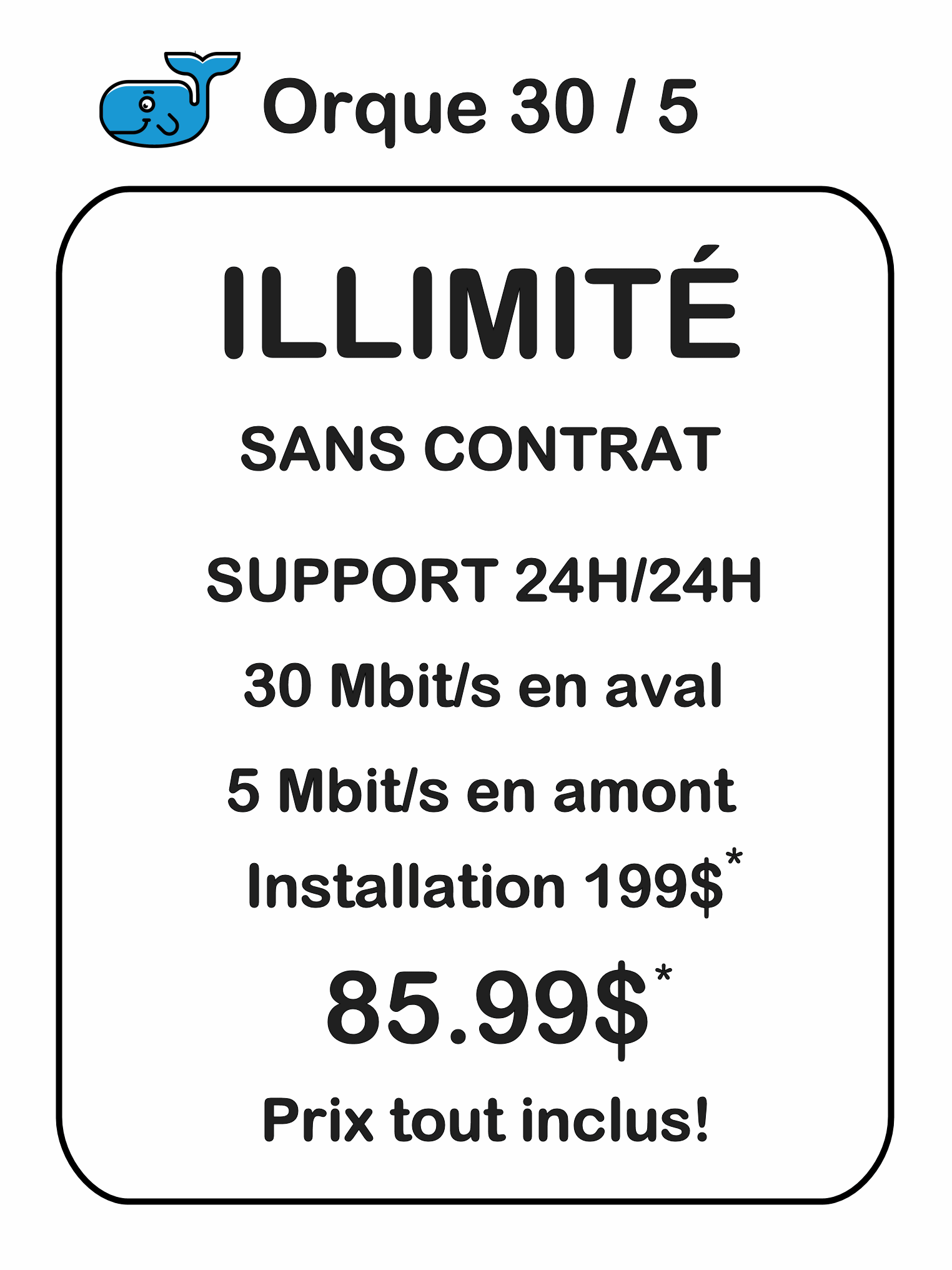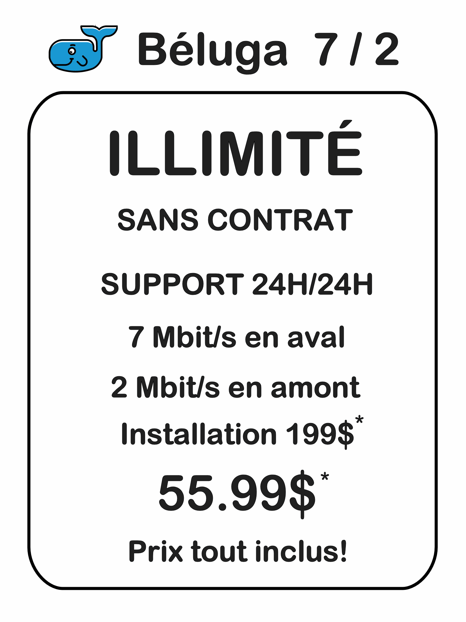 Un réseau fiable avec service personnalisé.Une vitesse stable en tout temps, pas de tracas. Forfait au goût du jour. Mise en suspension temporaire et réactivation gratuite. Facturation mensuelle, trimestrielle et annuelle. Paiements électroniques récurrents. Portail d'accès aux clients avec vos informations sécurisées.
